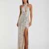 Elevate your evening with this sophisticated beige gown, meticulously crafted from hand-beaded mesh that showcases an intricate silver floral design. The high neckline and graceful long sleeves provide refined coverage, while allover beading creates luminous movement with every step. Constructed with strategic lining—full body and partial bodice for comfort and structure—this floor-length silhouette is the epitome of refined elegance