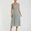 A sleek strapless midi dress adorned with allover shimmering floral appliques, beadwork and a streamlined trapeze silhouette – Mac Duggal