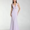 Elevate your evening look in this sleek crepe gown. Delicate satin bows adorn the sheer illusion neckline, adding a modern touch to this timeless silhouette. Perfect for formal occasions, galas, and black tie events, this dress seamlessly blends glamour and sophistication.
