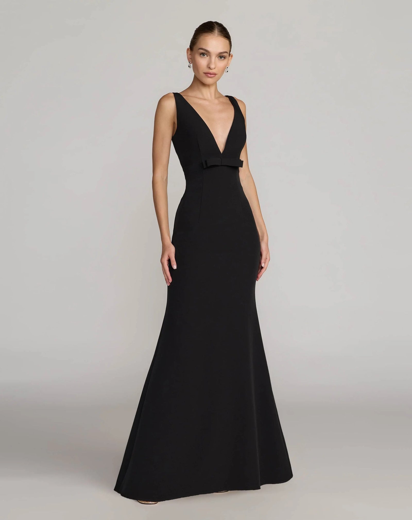 A sleek crepe mermaid gown featuring a plunging V-neckline, elegant bow detail, and a sculpted silhouette for a timeless, sophisticated look – Mac Duggal