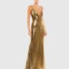 This chiffon faux wrap maxi dress features a v-neckline, short ruffle sleeves and thigh high slit – Mac Duggal