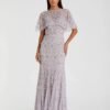 This embellished midi dress is perfect for garden parties and cocktail events. Crafted from mesh fabric, it features a v-neckline, romantic flutter sleeves, and allover beaded and sequin embellishments. – Mac Duggal