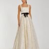 A strapless beaded midi dress featuring a fitted silhouette, satin waistband, and dramatic bow back with trailing tails for a statement finish – Mac Duggal