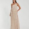 One-shoulder evening gown featuring allover sequins with a shimmering ombré effect and a flowing, elegant silhouette.