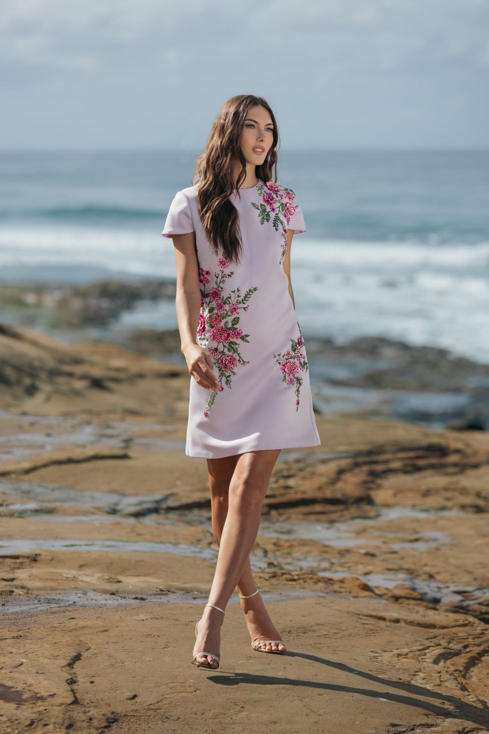 Perfect for cocktail parties and weddings, this mini dress effortlessly blends timeless sophistication with modern charm. Crafted from sleek satin, it features a high neckline, cap sleeve design, and beautifully vibrant embroidered detailing.